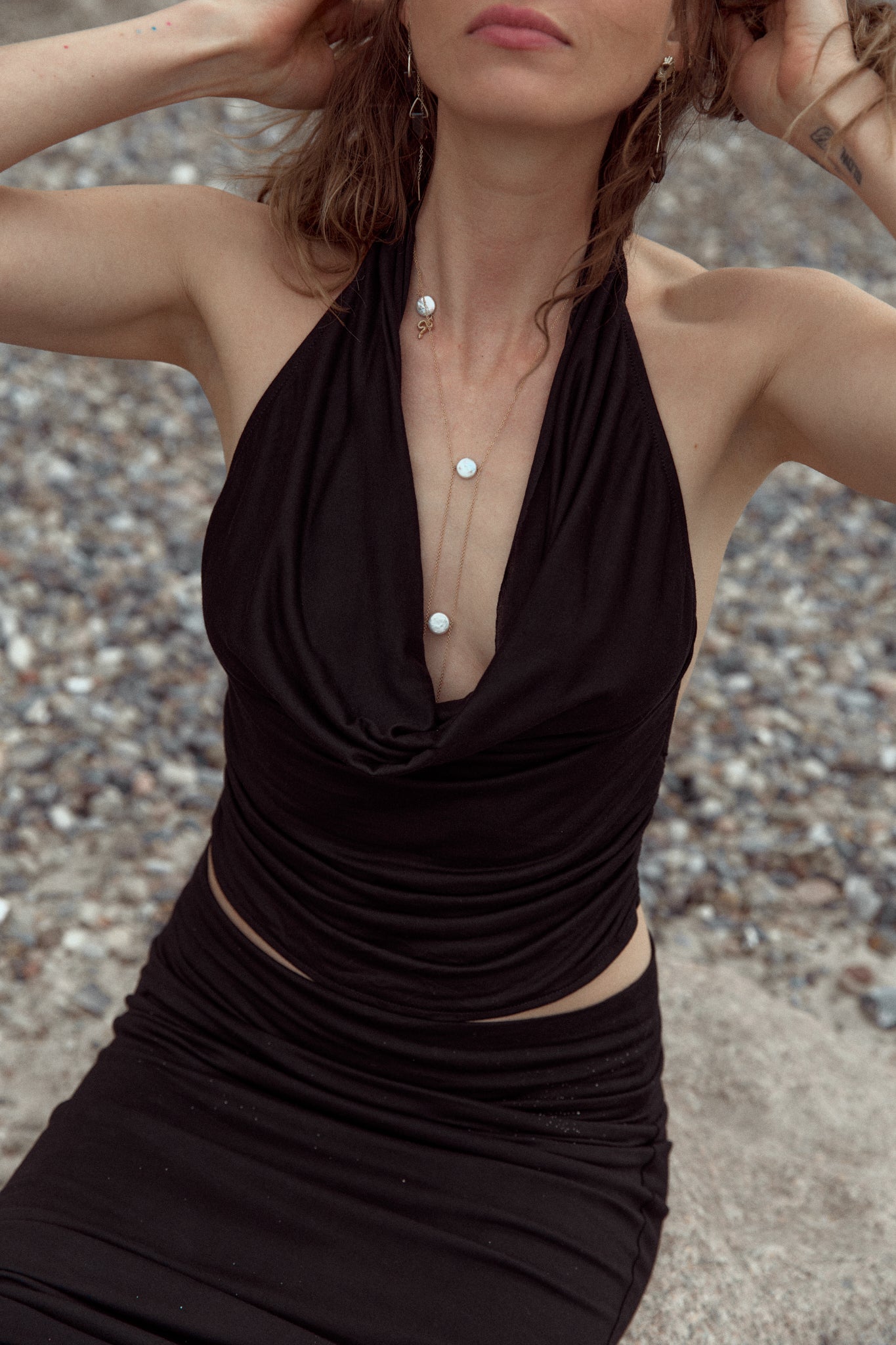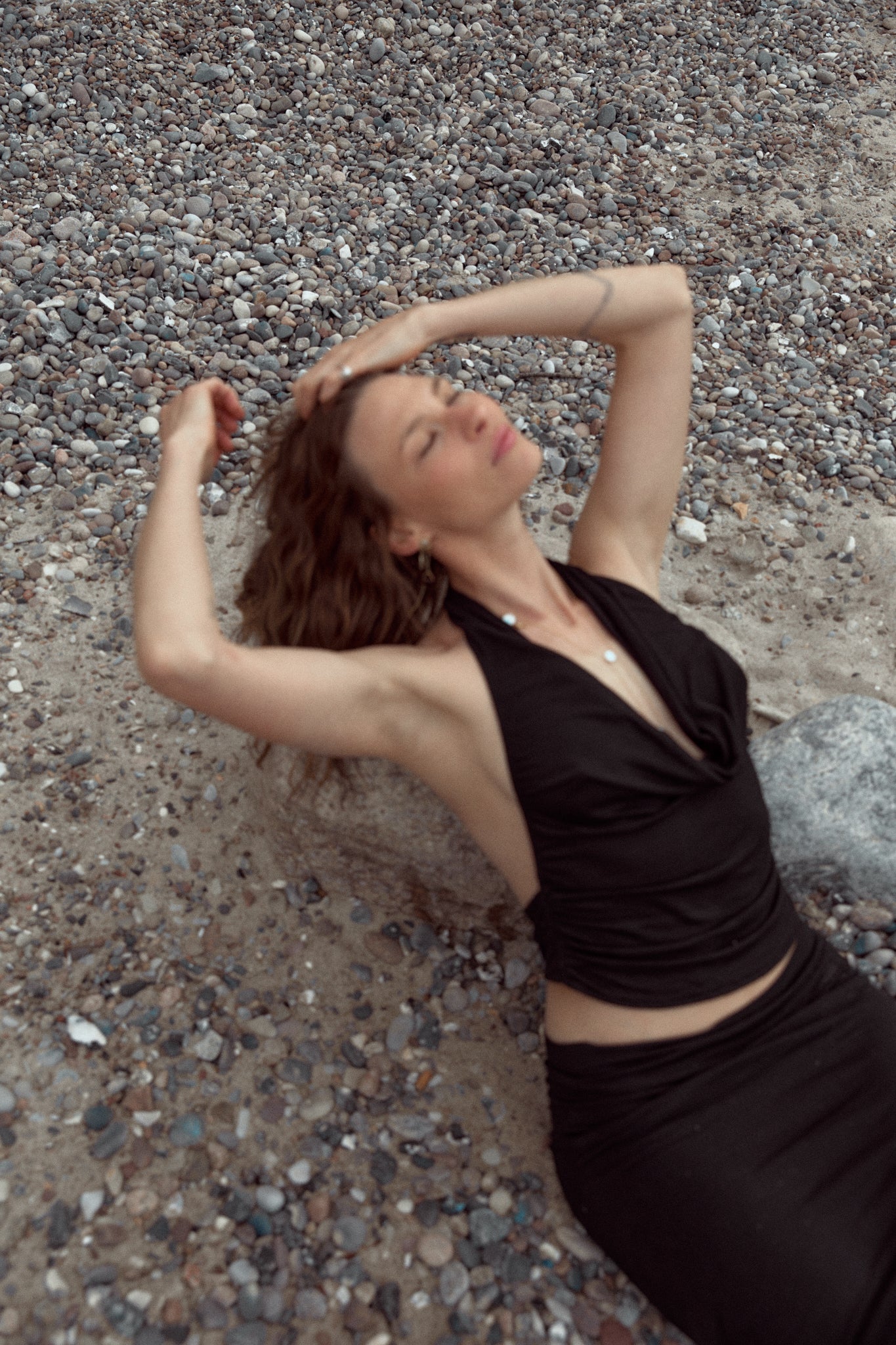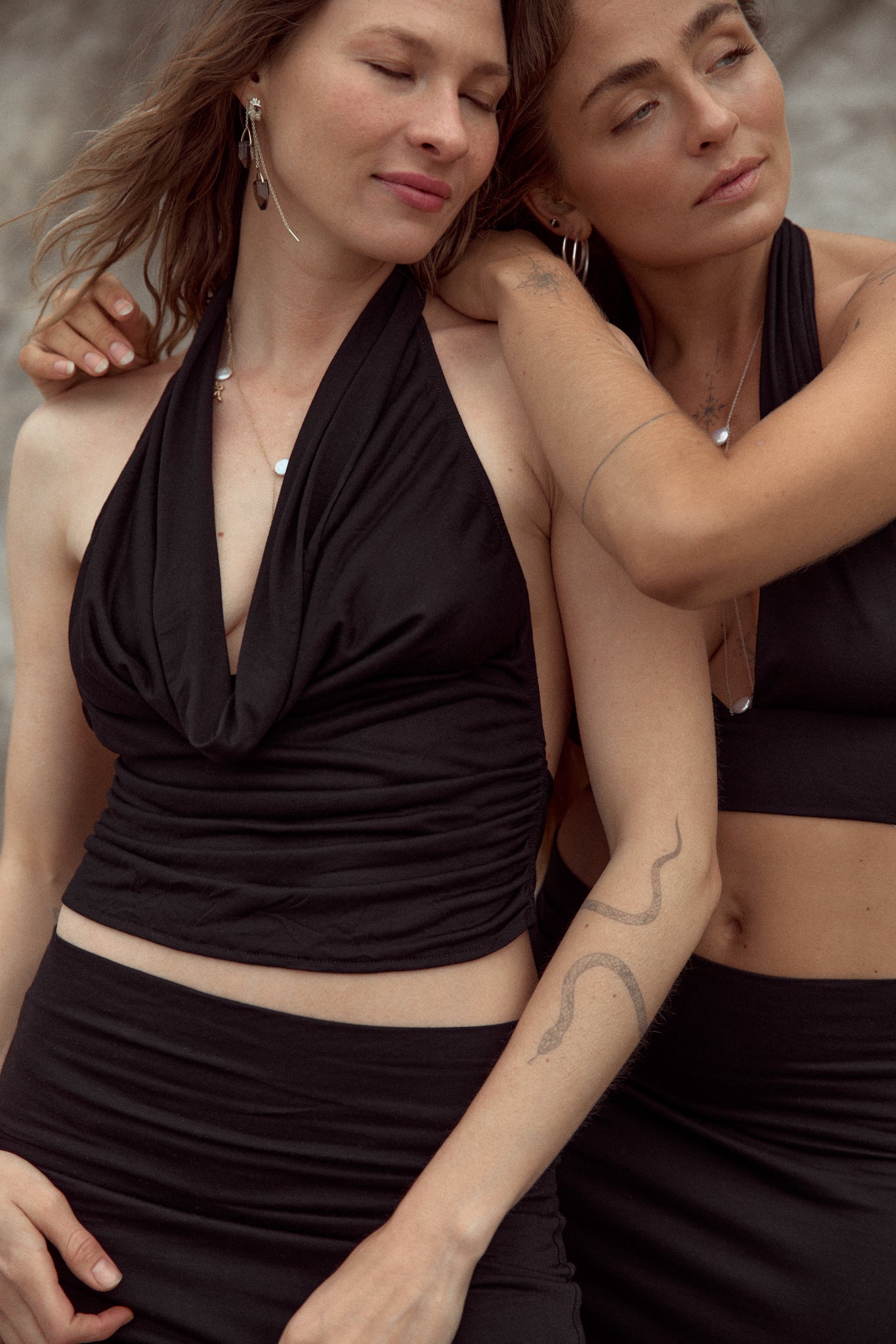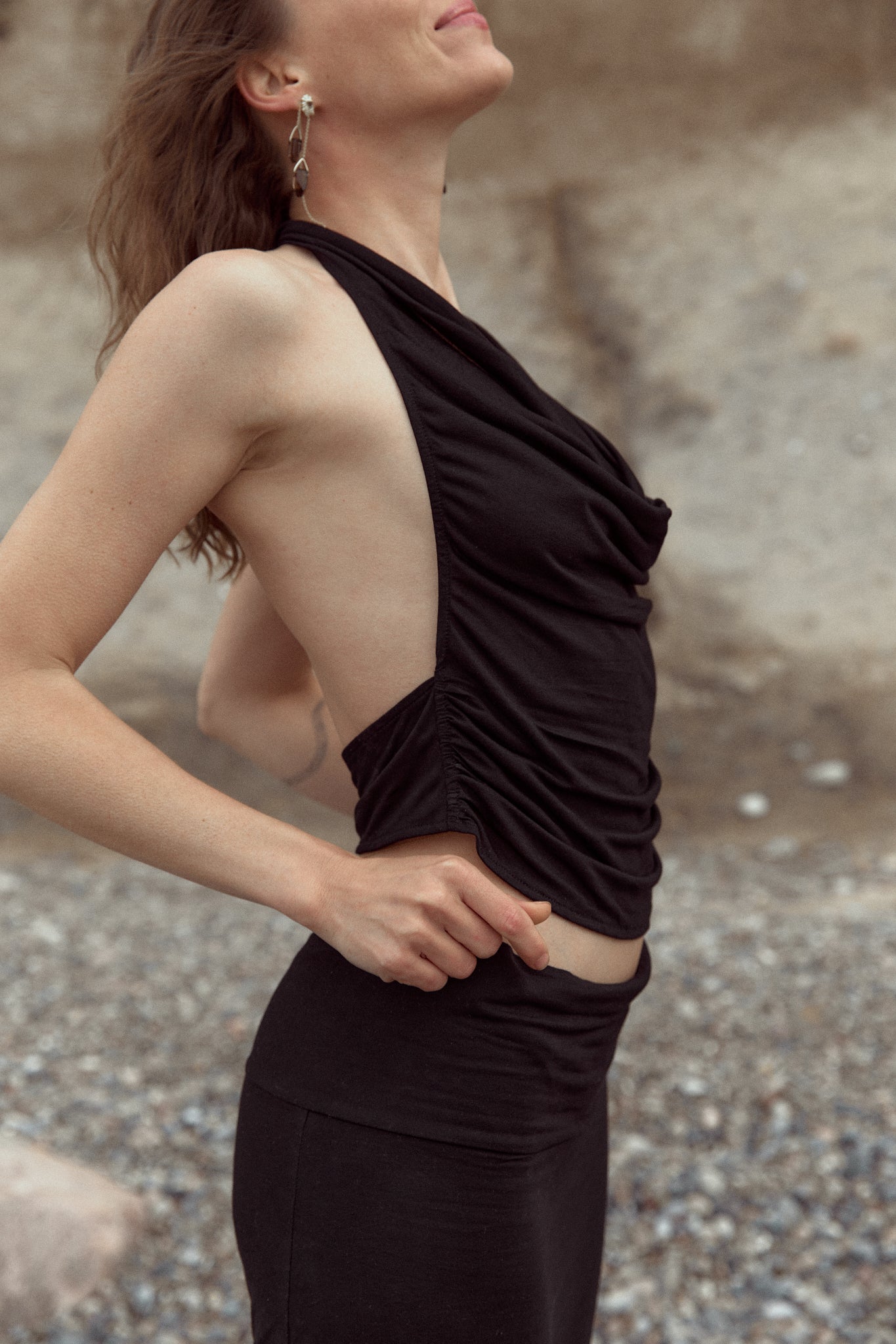 The cut is an ode to the hot 2000s and throw is in an era of wild feminine expression, glam and at the same time it has an effortless touch to it as you can simply „throw it over“. Combining THE look with an effortless wearability.