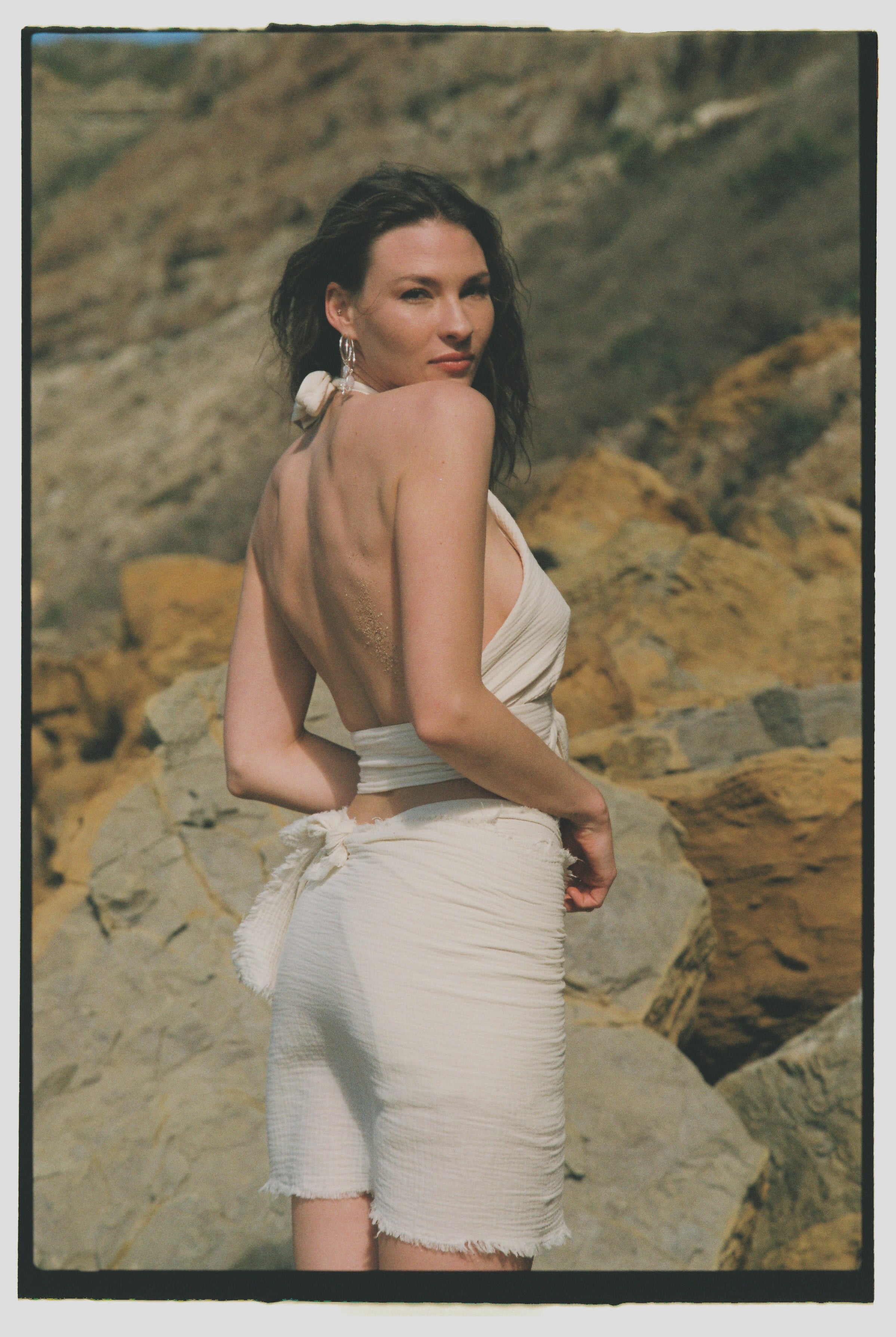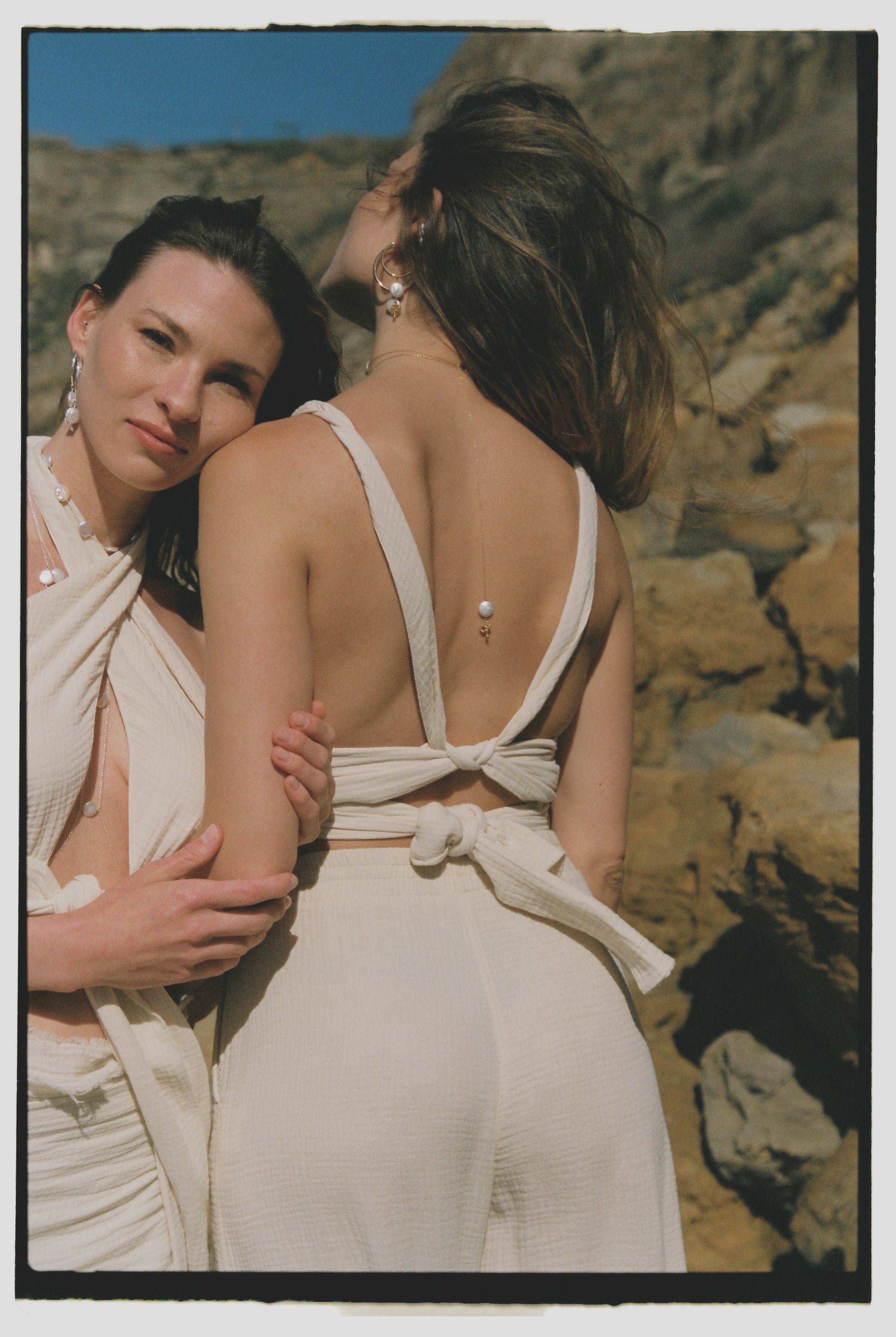 The wrap strap around the waist can be bound both to the front or back and the two straps that are covering the breasts can be bound in multiple ways f.ex. straight up, crossed or wrapped with a knot on the area of the chest. In the back it can be bound either in the neck with a beautiful bow or be bound onto the waist band with various binds like crossed, twisted etc. - for some ideas simply look through our gallery.