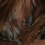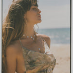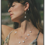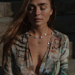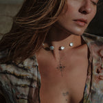 Our Aja choker is designed with five beautiful freshwater pearl and a delicate water pearl and snake closure that dangles down to the tip of the shoulder blades.