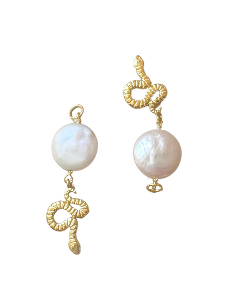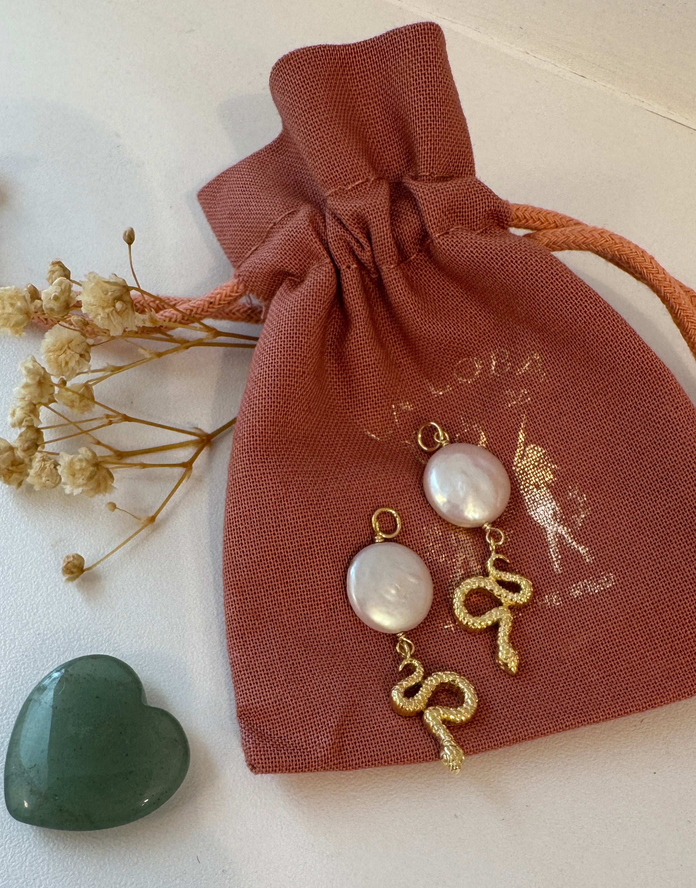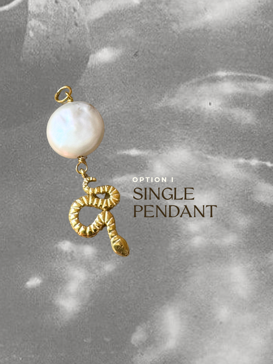 Our Jaya pendants carry the symbols of the feminine: the soft strength of the water pearl, the ancient power of the snake.