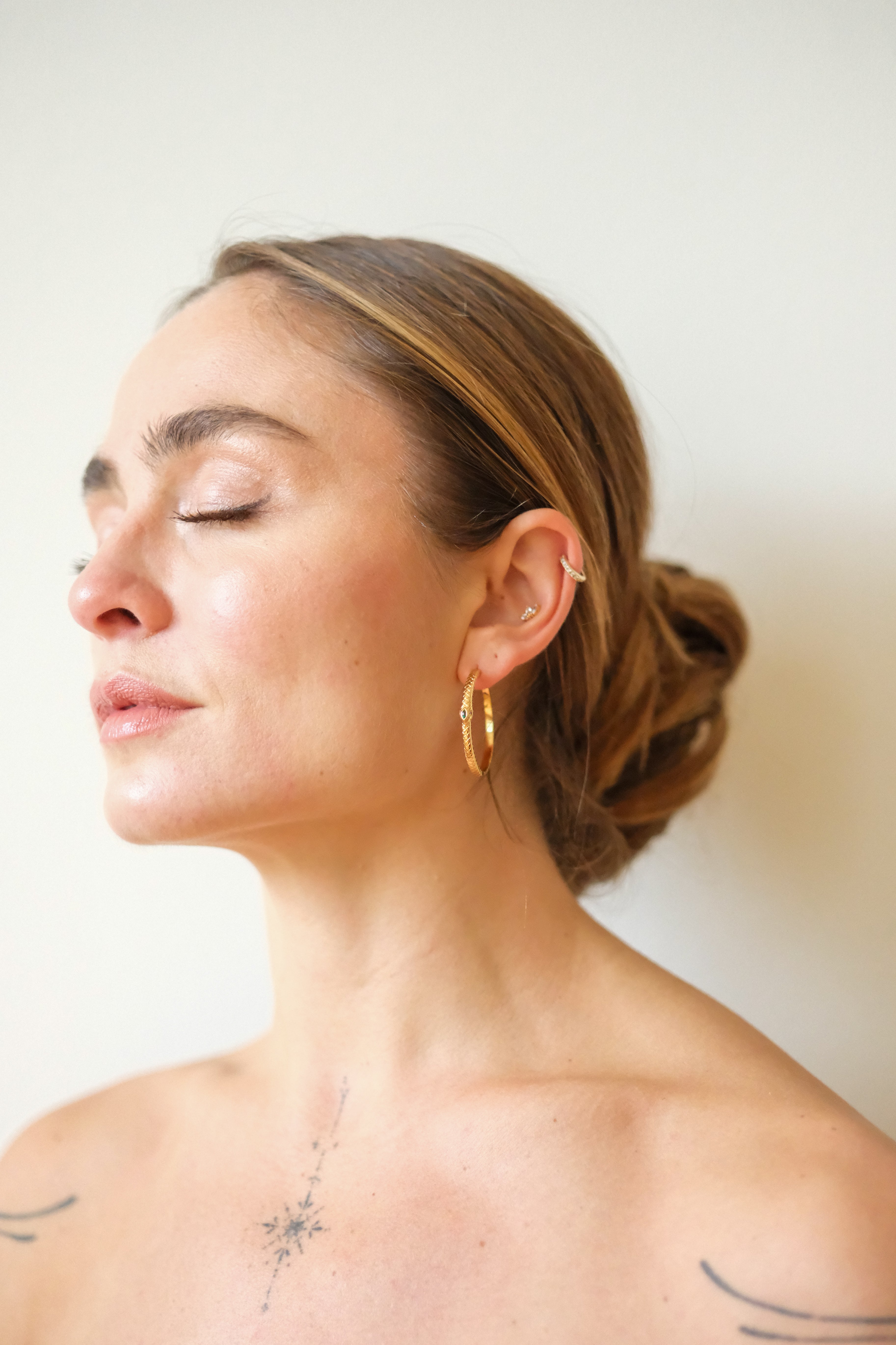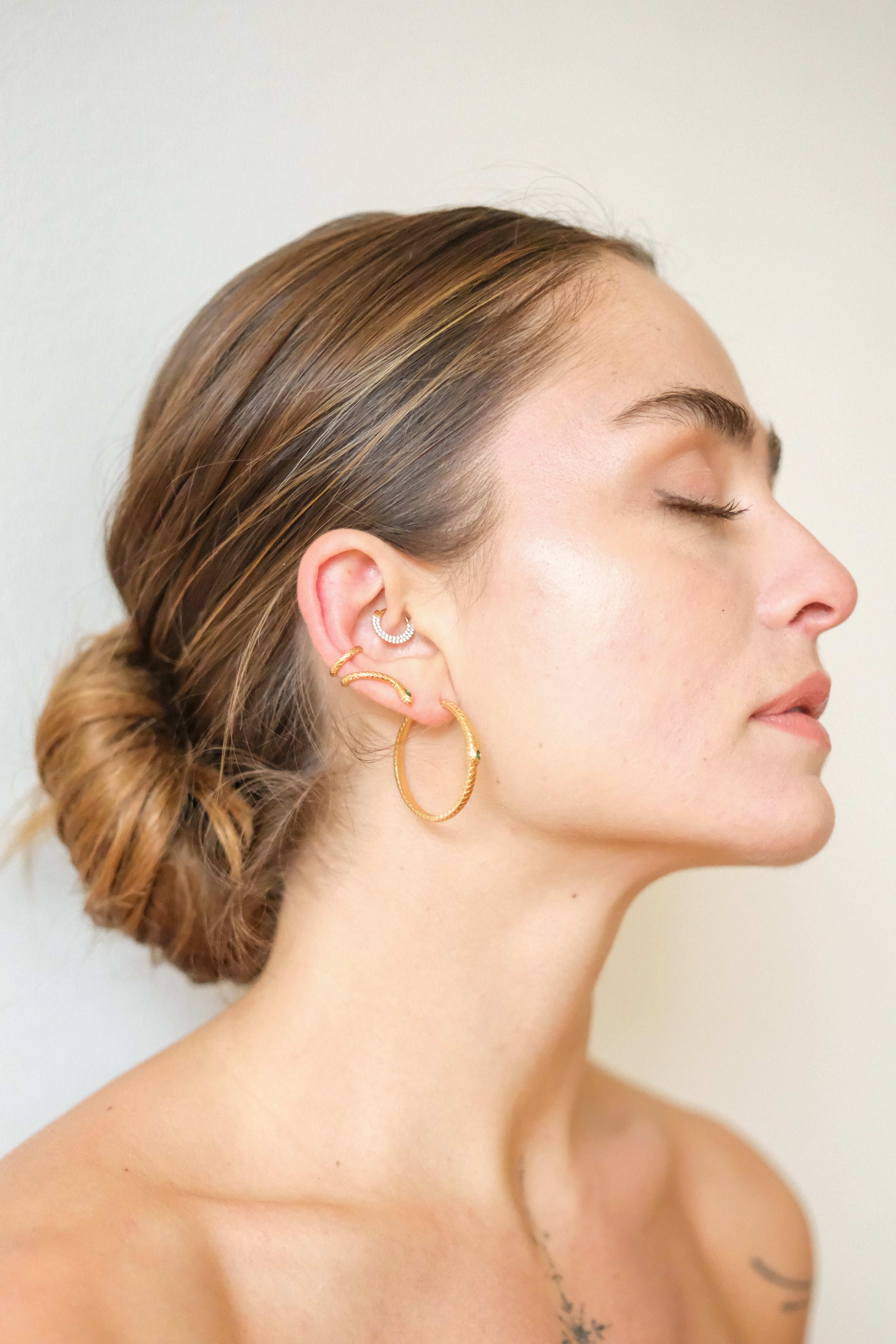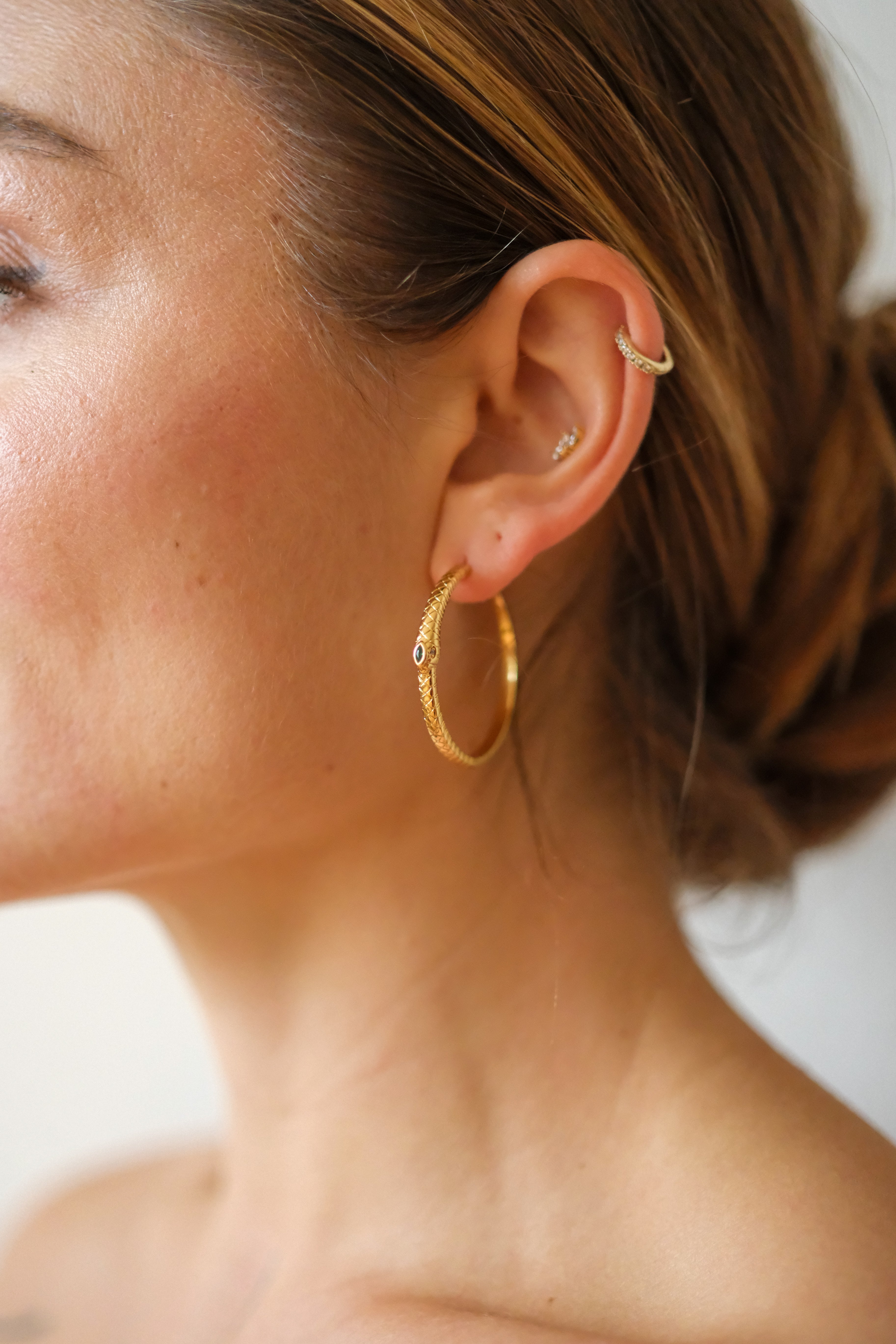 A modern talisman, the Ouroboros Hoop Earrings embody the eternal cycle of renewal. Their sleek, textured design wraps around the ear in a golden serpent pattern, symbolizing resilience, protection, and the beauty of continuous transformation.