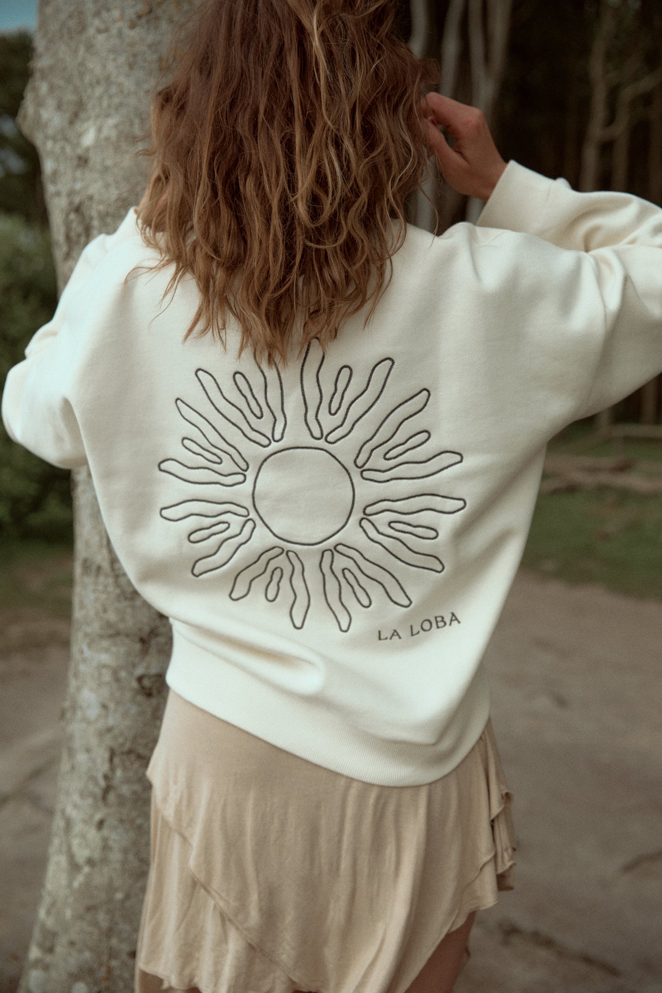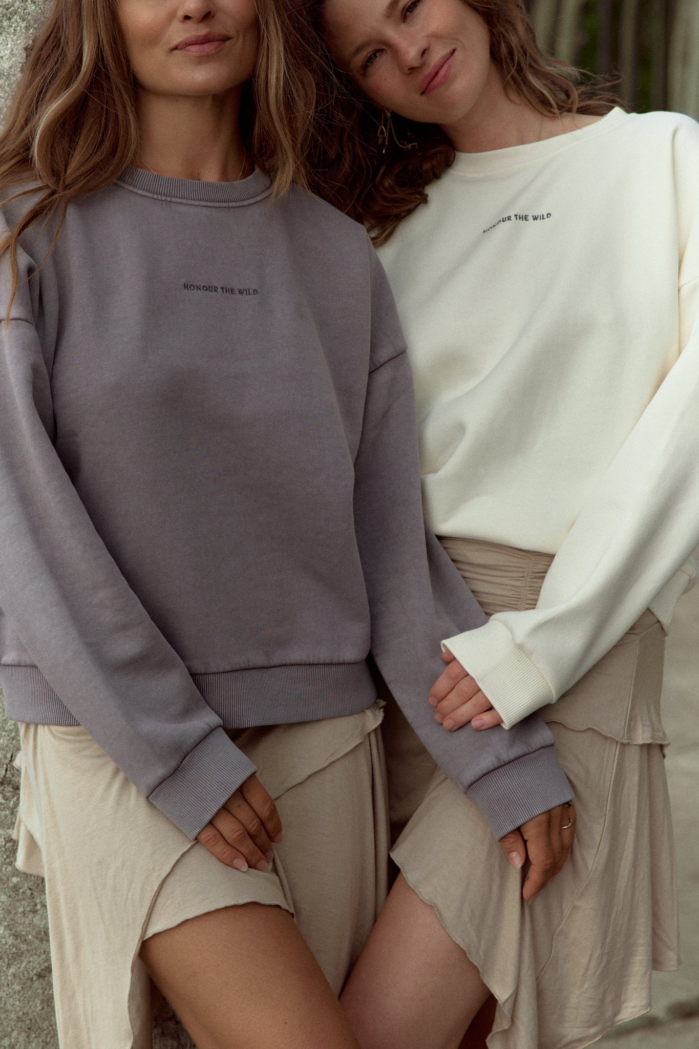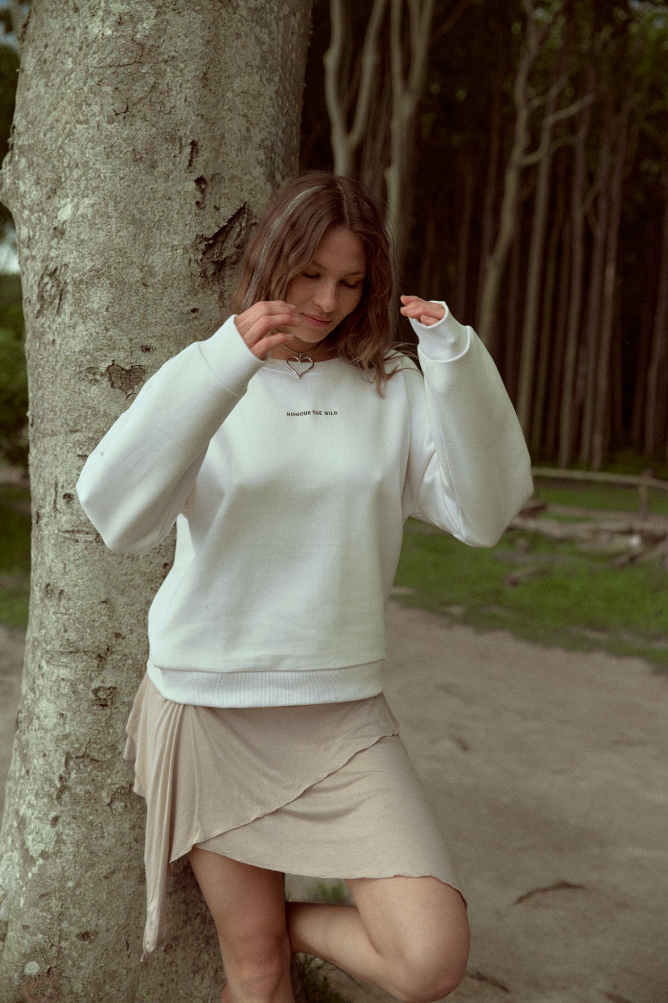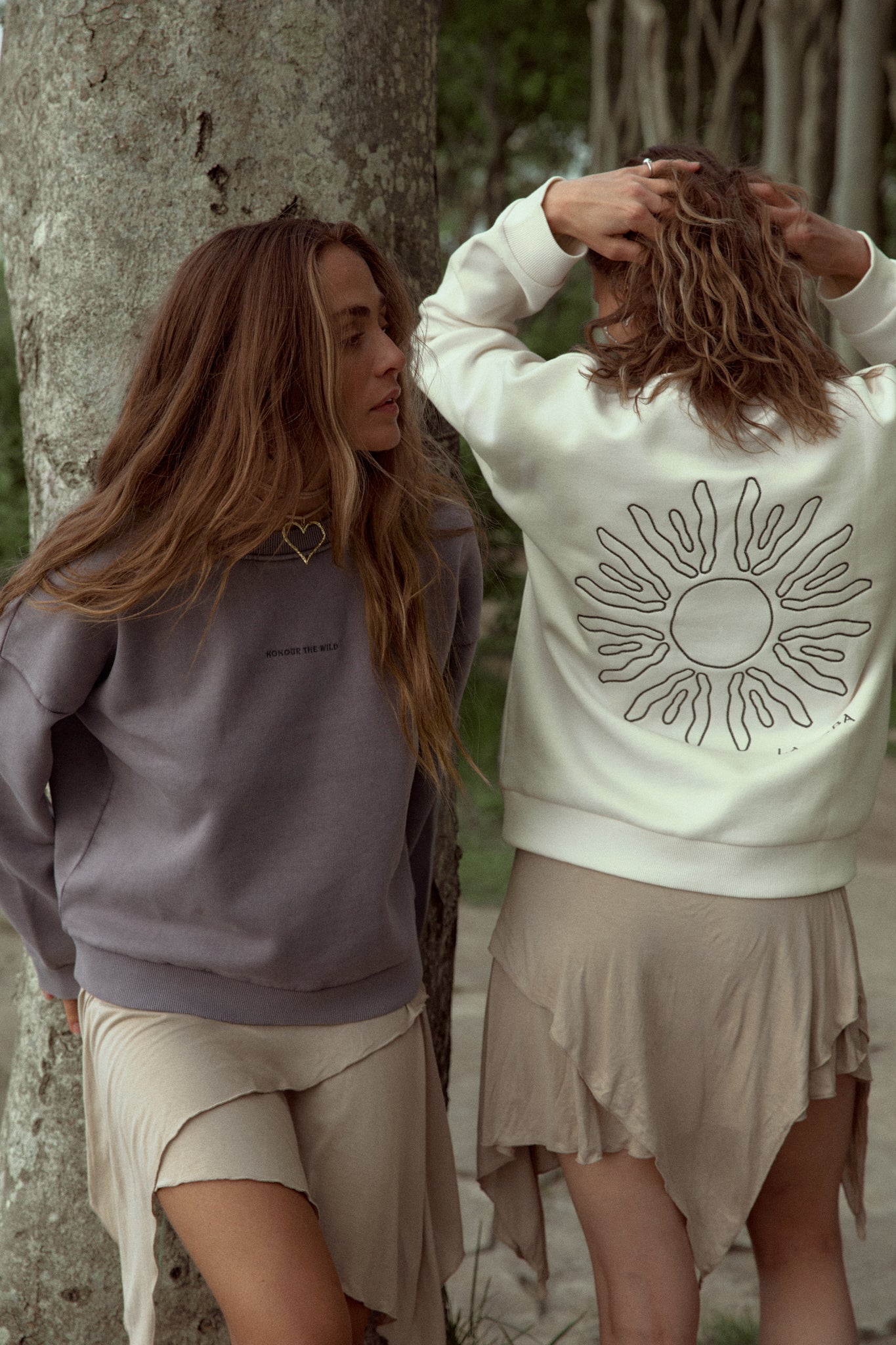 „Honouring the wild“ we made it our mission to create a sweatshirt that is simple and yet beyond “a sweatshirt”. A fully recyclable piece, we curated the most high-quality cotton into this sweat and it’s companion our t-shirt Idun that are both hand stitched with our symbol of inner radiance, that inner sun, that inner light.