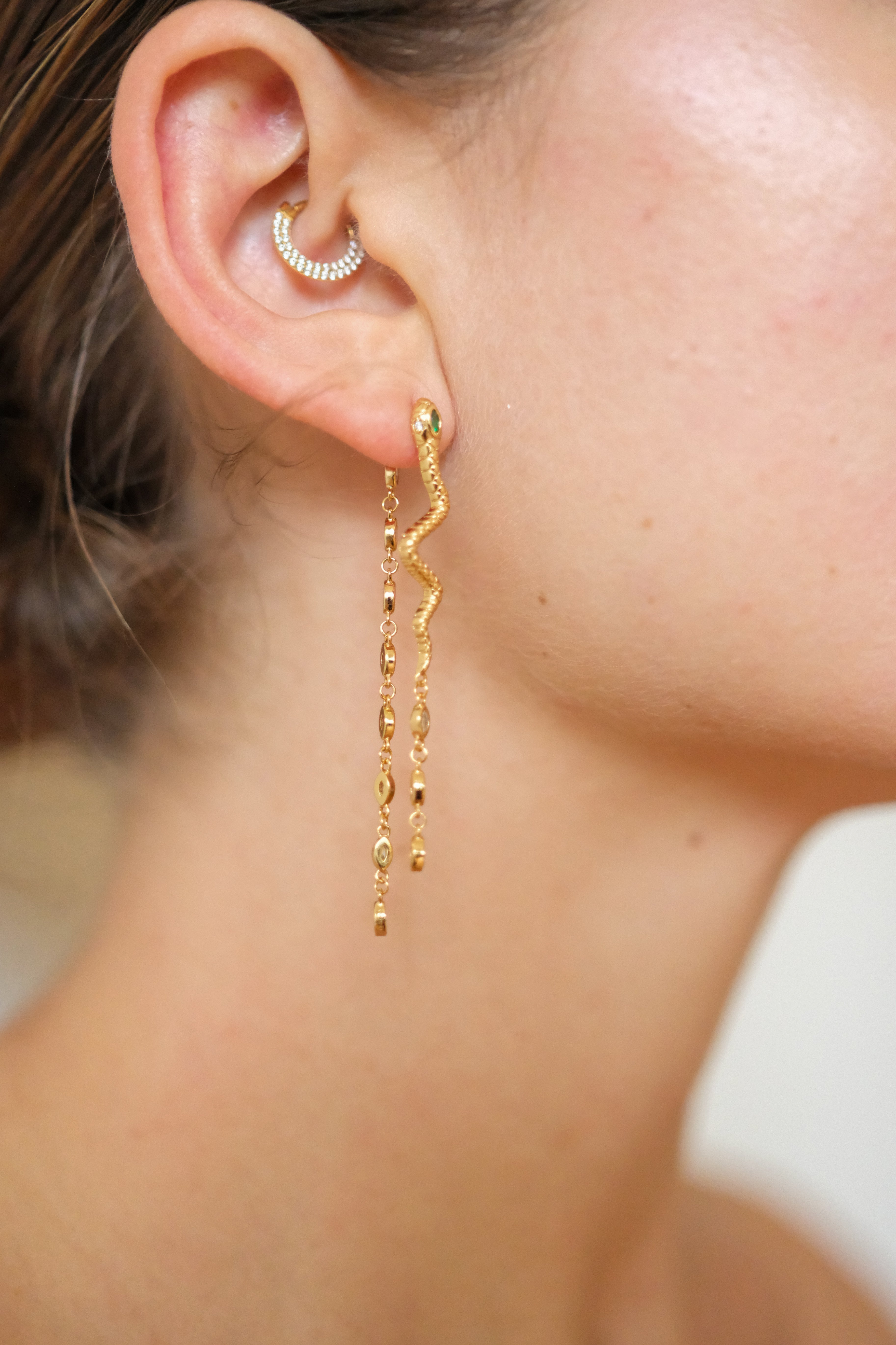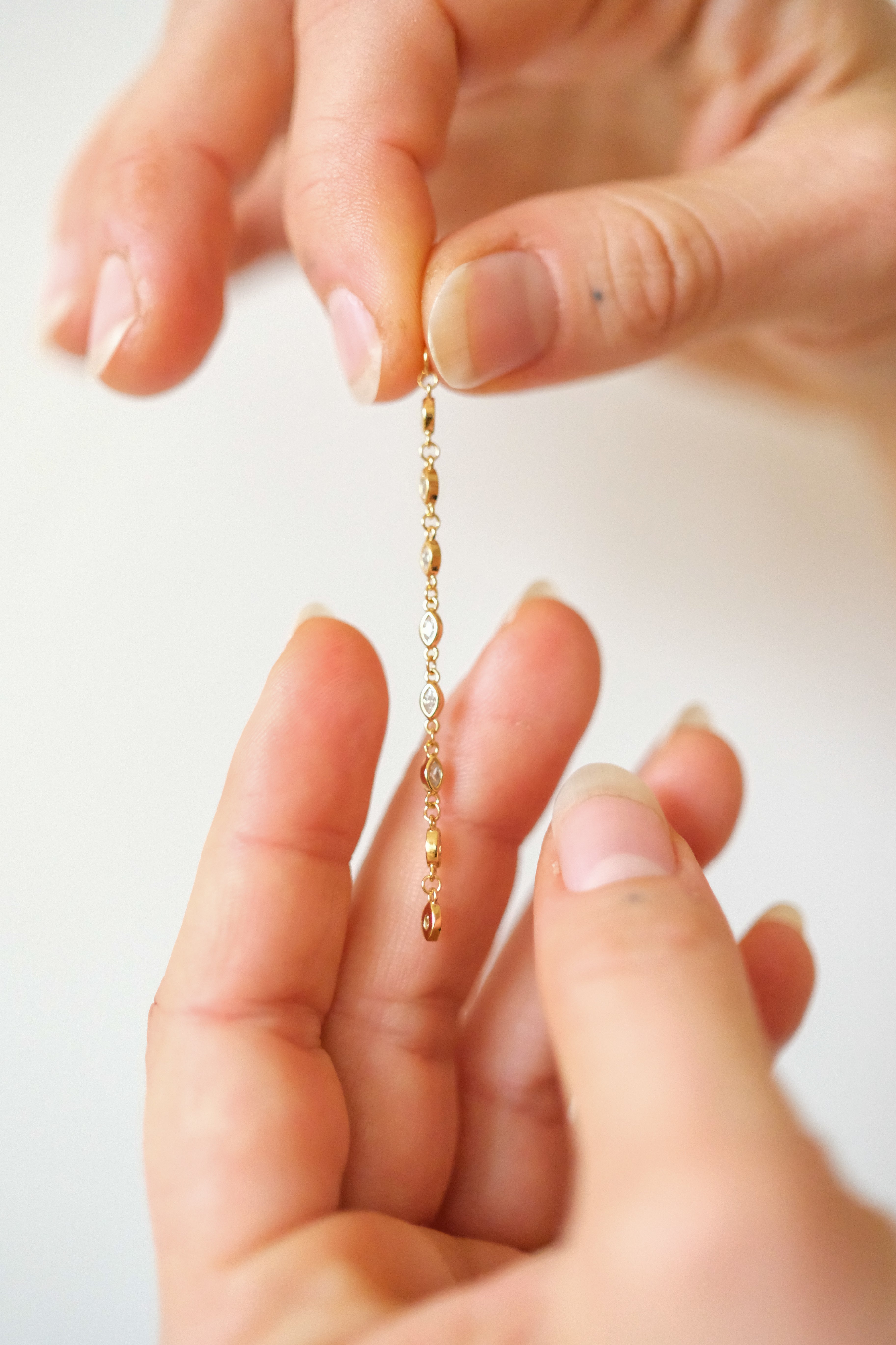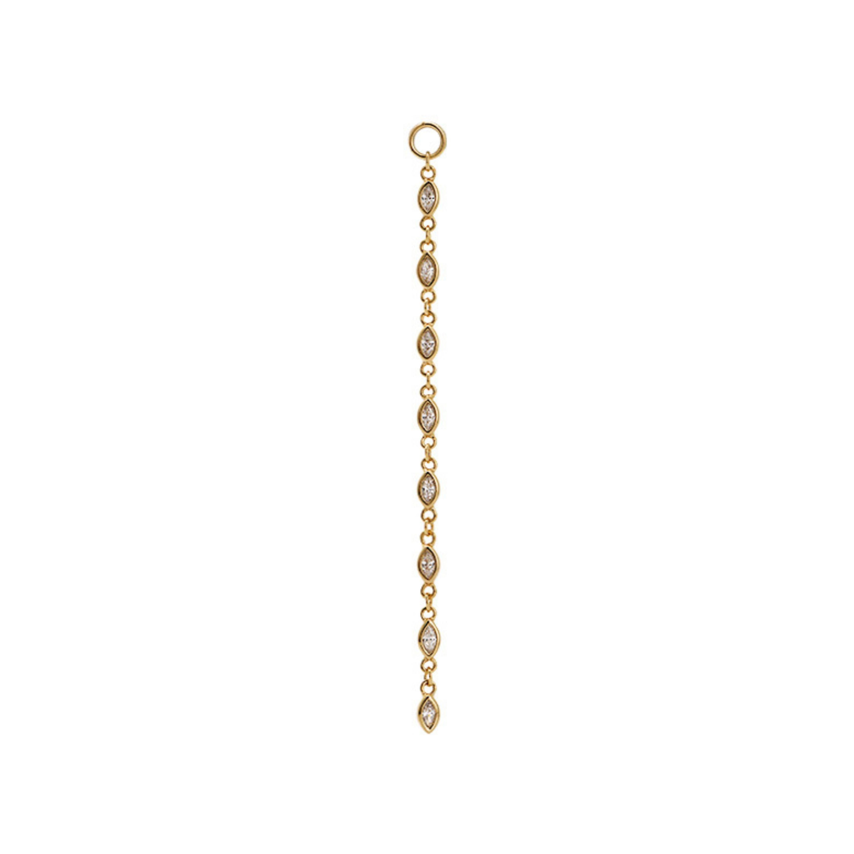 Ein zartes, schimmerndes Ketten-Element, das Hoops in Sekundenschnelle in Glam-Eyecatcher verwandelt. Mehrere marquiseförmige White Cubic Zirkonia Steine reflektieren das Licht wie kleine Diamantblätter – feminin, klar und edel.